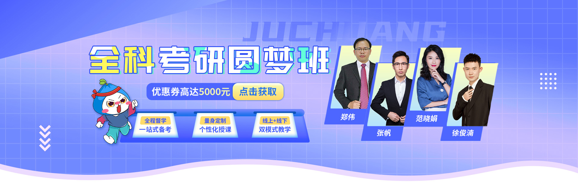 聚创考研是聚创教育集团旗下主营业务品牌,专注于高品质的考研教育服务,致力于为不同的学员提供个性化、智能化、全科全程、精细化辅导,助力学员一战成硕!